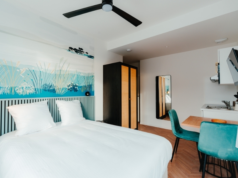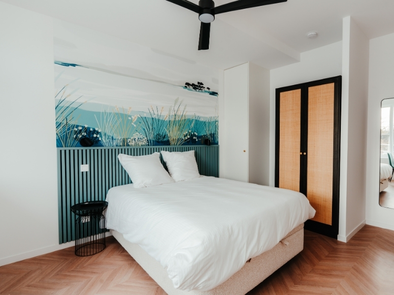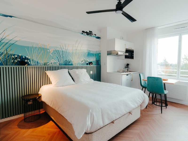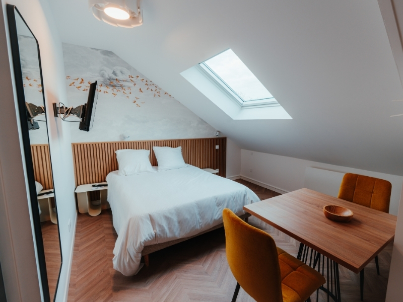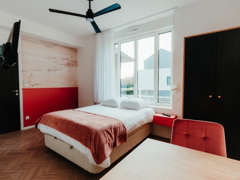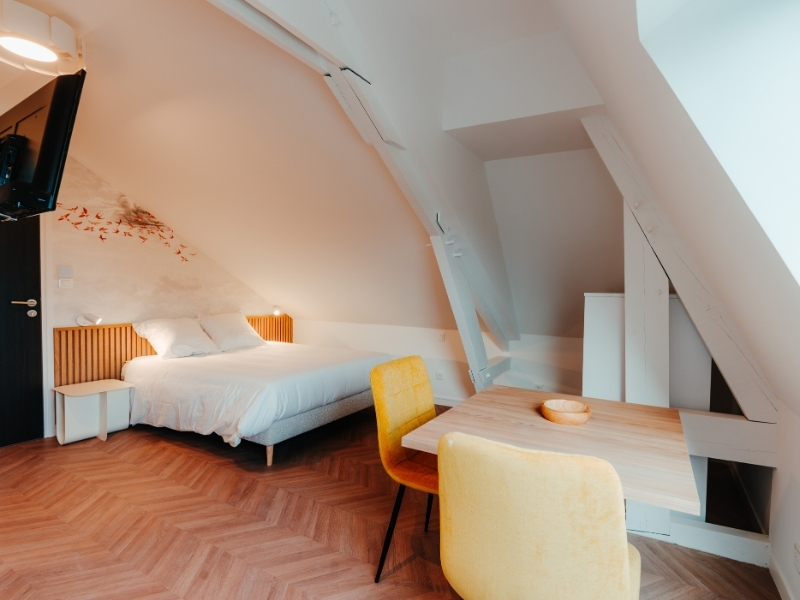 Lit double, bureau, rangements, déco soignée : tout est prêt à votre arrivée. Vous avez votre espace, votre rythme, votre intimité.
